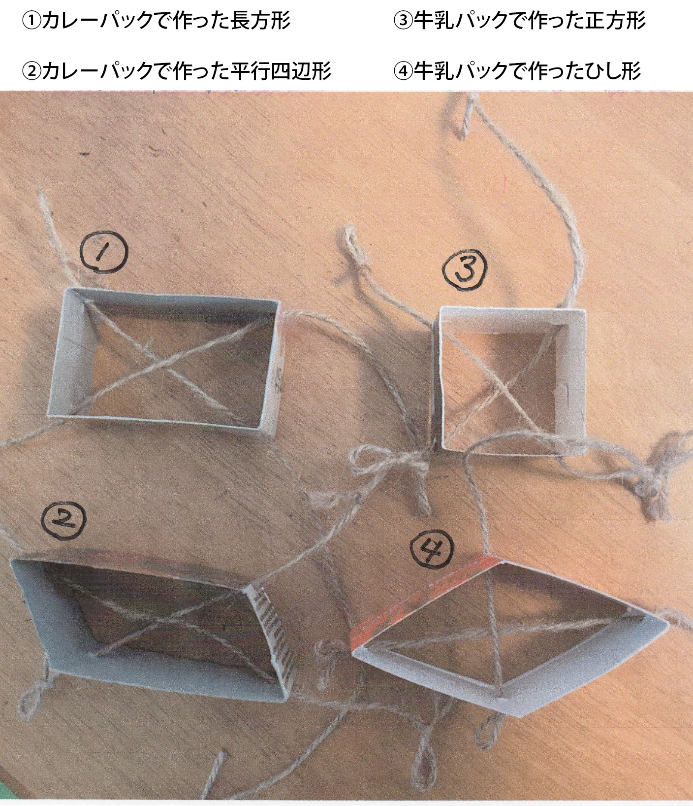 カレーパックと牛乳パックに麻ひもを通し、それぞれの図形の角・辺・対角線の関係を学びます。